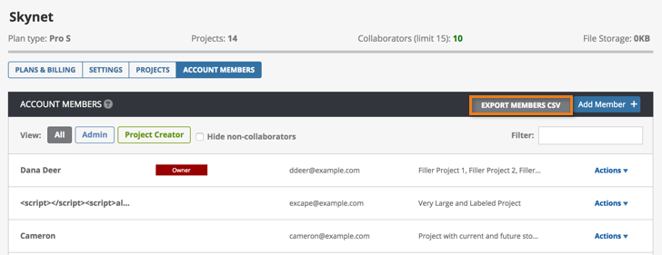 Account owners and admins can export a CSV formatted list of all account members from the Account Members page.