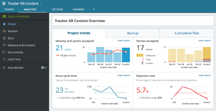 Analytics are charts and reports that help you see the big picture and useful trends in each of your projects.