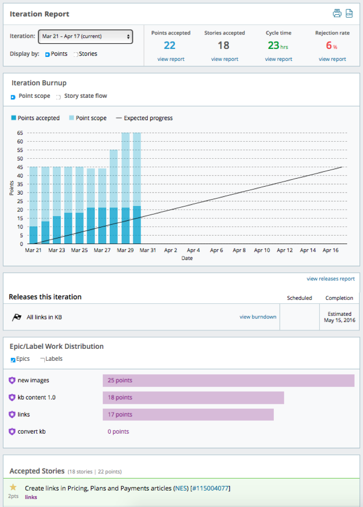 The iteration report also shows how much progress was made toward the next release, as well as in-progress epics. You can see how the team’s work distributes across epics, and view a list of in-progress stories from this iteration.