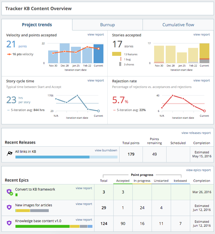 The Project Report also shows information about the most recently completed and in-progress releases and epics.