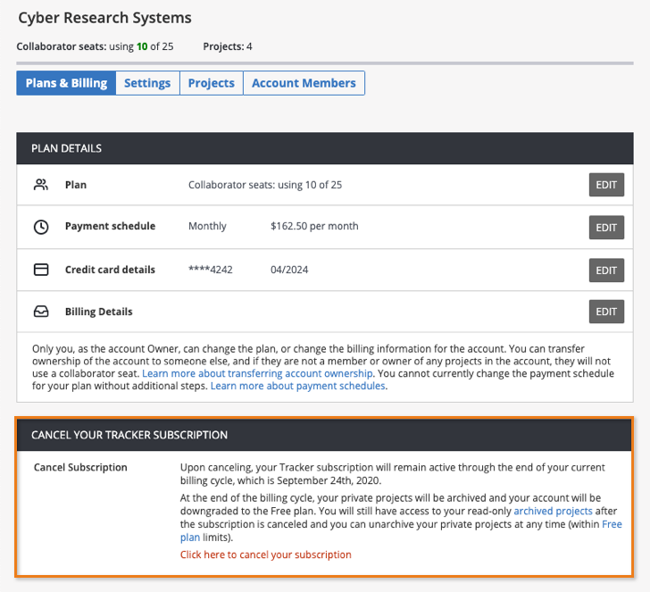 - The cancel flow will walk you through scheduling your Tracker subscription to be canceled at the end of your current billing cycle. When that time comes, your private projects will be archived and your account will be downgraded to the Free plan. You will still have access to your read-only archived projects after the subscription is canceled and you can unarchive your private projects at any time (within Free plan limits).