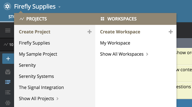 If you decide to use multiple projects, Workspaces can help you maintain visibility of all the work in progress and planned. Workspaces allow you to view backlogs in different projects side by side, drag and drop stories to move them between projects, search across all the projects in the Workspace, see all My Work stories for them, and much more. For more on the benefits of Workspaces, please see Managing multiple projects: Workspaces.