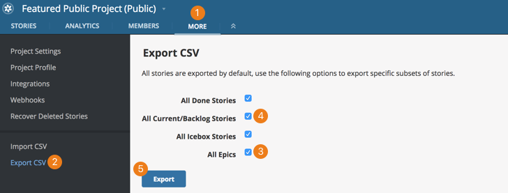 - You can also select subsets of stories, including Done, Current/Backlog, or Icebox stories.