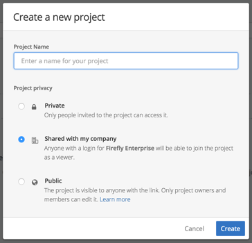 By default, the Enterprise-only Shared with my company project privacy option is selected on the project creation modal. If you leave it selected, anyone from your company will be able to join this project as a Viewer (viewers are read-only users), however, you can change this so that account members can join as a member. If you make the project private or public, you can always change that setting later in Project Settings.