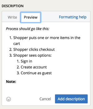 When you use markdown in a story or epic description or comment field, you can click the Preview tab to see how the markdown will render after you save your changes.