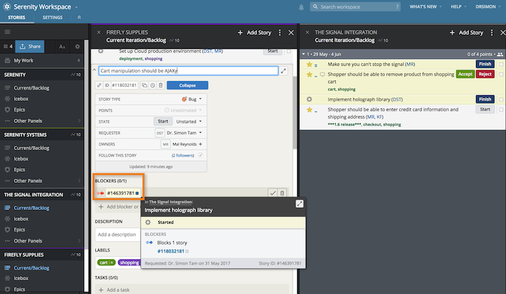 For example, if a story waiting for a design story, you can add a blocker with a link to the design story (which may be in a different project), and if desired you can add a label “needs design.” If a delivered story can’t be accepted yet due to a dependency on another story, simply add a blocker with a link to the other story. Blocking stories link back to stories they’re blocking. Blockers help keep dependencies front and center for everyone on the team.