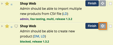 You can also apply a unique label to related blocked stories across different projects in a workspace. You can then search on the label or combination of labels in your workspace to show all the related stories in one panel, listed by project. You can simply click on a label in a story to search for all stories in a workspace (or project) with that label. Clicking the Reveal icon for a story in a Search panel shows you where it is in relation to other stories in the Current, Backlog, Icebox, or Done panel for the project it is in.