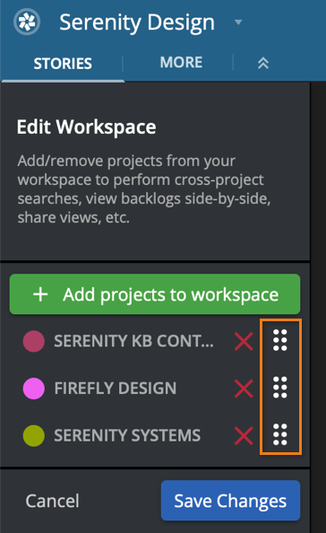 You can click the move project icon to drag/drop projects to change their position. The order in which your projects are positioned will also determine the order in which stories are returned in a Workspace search. Click Save changes when done reorganizing your projects.