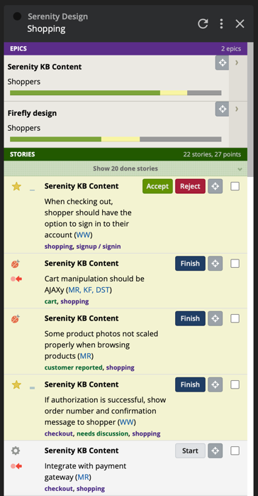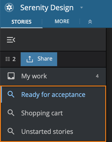 You can perform searches across all of the projects contained in a Workspace. For instance, you could perform a search to show all the stories and/or epics that have the word “Shopping” in the title. You can use the same label name in multiple projects, and search for that label across all projects in your Workspace.