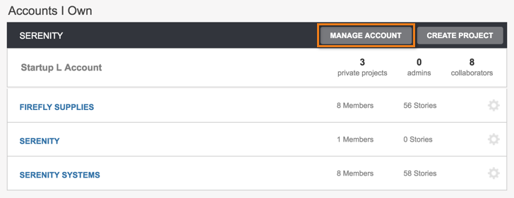 Your Accounts page allows you to: see accounts that you own, administer, or are a member of; create an account; and manage your plan, credit card information, members, projects, and account settings.