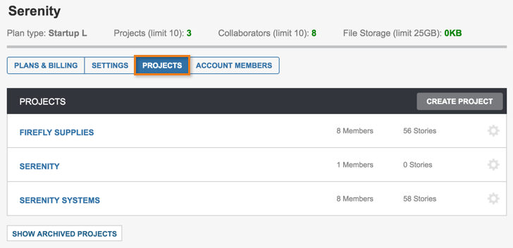 Click Projects to view and manage all projects that exist within your account. You can view and edit settings, manage project members, and archive and delete projects from this page by mousing over a project and clicking the appropriate link from the menu. You can also view all of your archived projects by clicking Show Archived Projects at the bottom of the page.