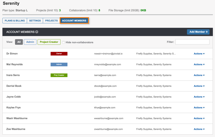 Click Account Members to explicitly invite or remove members and manage your collaborator count. You can also enable project creator permissions, as well as edit account roles.