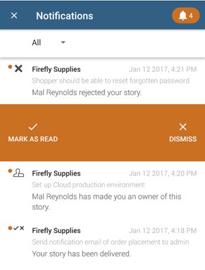 Tap Notifications to see your in-app notifications from your Tracker projects. You can filter notifications by Unread, Mentions, and All. Tap a notification to see the story activity/comments. You can swipe from left to right to Mark As Read and/or respond to notifications.