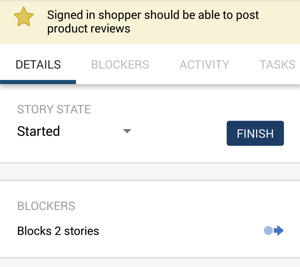 Expand the story and go to the Blockers tab to see details of a story’s blockers, as well as any stories it is blocking, to add or edit a blocker, or to resolve a blocker.
