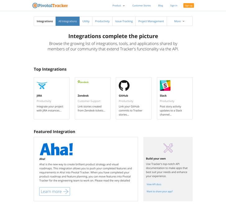 All of the third-party applications were built using Tracker’s robust API, so you might consider building your own custom integration or tool. If you’ve already done so and would like to be listed with our other integrations, please email Tracker Support. Simply send us the URL, a short description for the list, and its category (e.g., mobile, reporting, or Chrome). We can also include a screenshot or logo. Once it’s posted, we’ll tweet via @pivotaltracker to be sure the Tracker community sees your work!