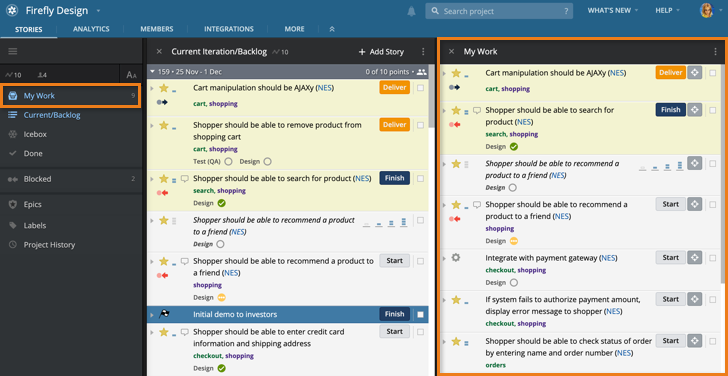 The My Work panel allows collaborators to see all of their assigned stories (i.e., stories they own) that have not yet been started, as well as those stories assigned to them that are in progress (i.e., started). Additionally, all stories in the delivered state (i.e., ready to be accepted or rejected) for which you are the requester are displayed, as well as any stories containing Reviews in which you’ve been assigned as a reviewer. The My Work panel in a Workspace affords even more visibility as it allows you to see stories across all of the projects contained in your Workspace. Stories in the accepted state are excluded from the My Work panel by default.