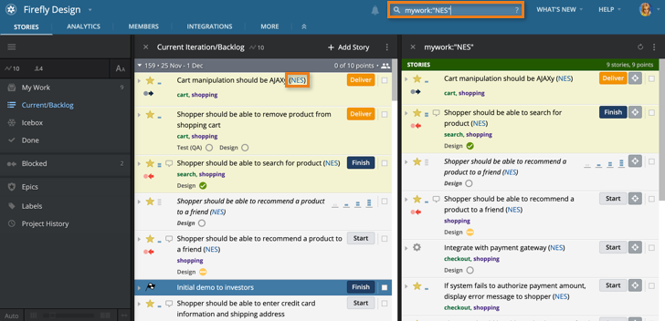 You can also use Search to perform a My Work query for a given user in a project by either clicking on a user’s initials in the collapsed stories view, or by using the Search field in the top navigation menu (i.e. mywork:"NES", see image below).