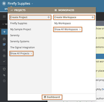 From the Projects menu you can also create a project, create a Workspace and access your Dashboard. To see all the projects or Workspaces you’re associated with, click Show All Projects or Show All Workspaces.