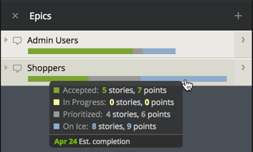 As you prioritize and work on stories associated with an epic (via the linked label), a multicolor progress bar will appear on the epic (see above). This shows how big the given epic is relative to other epics, and how much of the epic has been accepted, is in progress, prioritized, or on ice. You can mouse over the progress bar with the mouse to see a more detailed breakdown, as well as an estimated completion date, which is the last day of the iteration that the epic’s last prioritized story appears in, in the Backlog. Tracker marks an epic Done once all of its stories—including any in the Icebox—have been accepted.