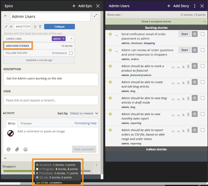 There are two ways to add a new story to an epic. One is to first open the epic’s stories panel.