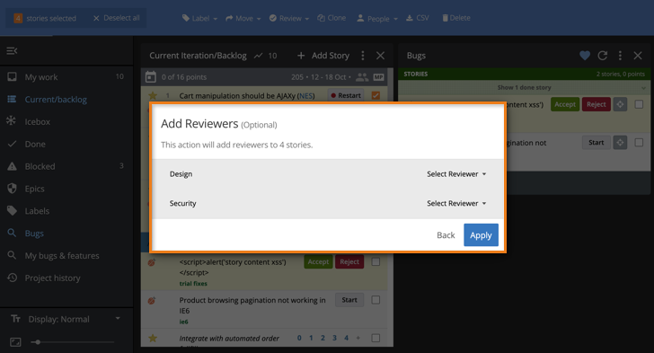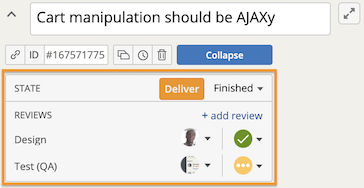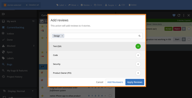 Reviews allows for all team roles to collaborate on story acceptance in parallel (versus sequentially), representing everyone’s progress and contributions towards a given story.