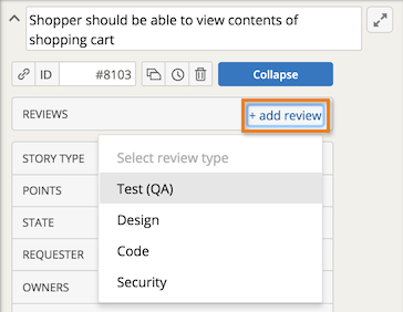 - Expand a story and select the + add review button, then choose the type of review you’d like to add. The default review types are Test (QA), Design, Code and Security. You can create your own custom review types as described in the Managing custom review types section of this article.