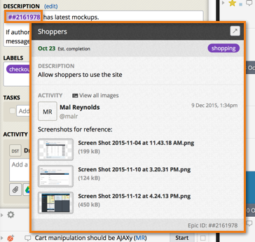You can embed a link to a story or epic in the description, task, or comment of another story or epic, by either copying and pasting the story/epic URL, or by using the short #STORY_ID (or ##EPIC_ID for epics) format. Afterwards, hovering over the embedded link will produce a visual preview of the linked story which is known as the story card flyout.