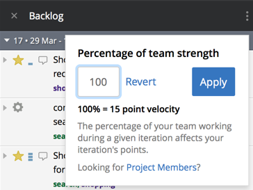 Iteration Team Strength allows you to tell Tracker about variations in your team from iteration to iteration. This helps you account for things like holidays, sickness, or other temporary team fluctuations.