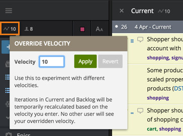 To use Velocity Override, simply enter your velocity value in the upper left, below your project name. A box will appear that will allow you to enter the hypothetical velocity of your choice. After entering the new value, you will see your Backlog adjust as a result. Only you will see this; other project members’ sessions will not be affected. The next time you reload your project, you’ll see the velocity revert to its actual calculated value.