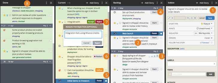 Tracker’s lightweight workflow supports teams as they deliver value to the business at a sustainable pace. Let’s walk through a simple example of Tracker’s feature story workflow.